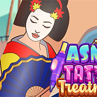 和服を着た女性が扇子を持ち、隣に「ASMR Tattoo Treatment」というロゴがあるイラスト。