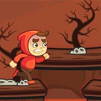 赤いフードを着たキャラクターが茶色のプラットフォーム上を走り、枝の多い木と黒い鳥が背景にある。