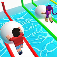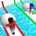 カラフルなレーンで大きな白いボールを押しながら水面を進む二人のキャラクター。