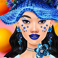 青い帽子とドレスを着た女性が、青いメイクとアクセサリーを身に付け、カラフルな背景に立っているイラスト。